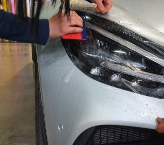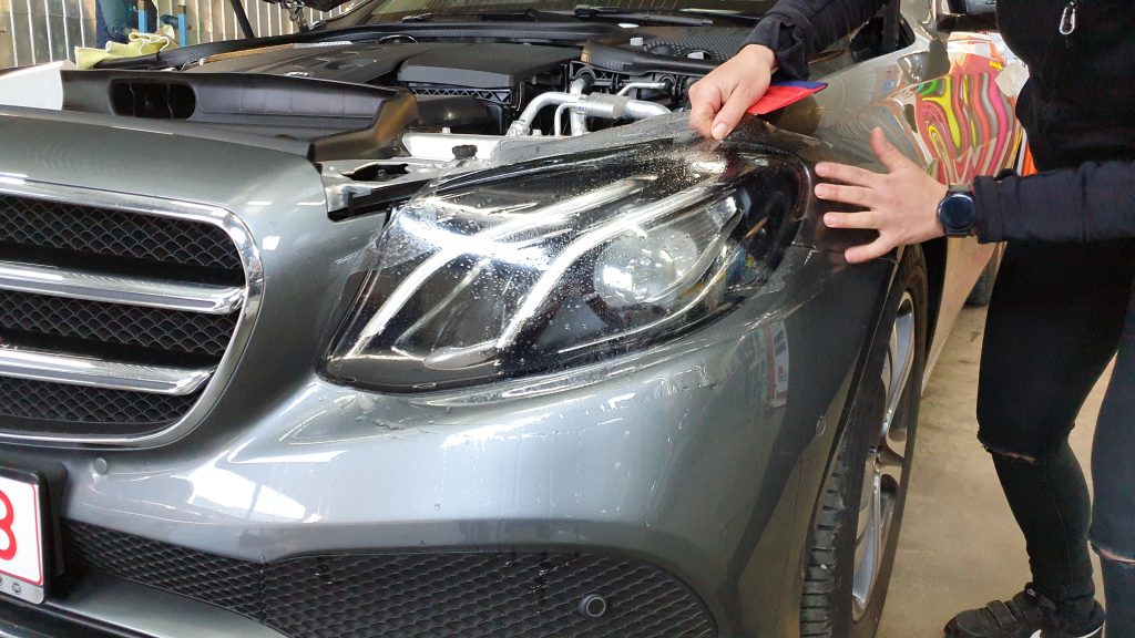 După polish, farurile sunt curățate din nou pentru a elimina orice reziduuri de pastă de polish și pentru a verifica rezultatele. Aplicarea unei folii de protecție este o soluție eficientă pentru a preveni îmbătrânirea rapidă și deteriorarea farurilor, protejându-le împotriva zgârieturilor, impactului cu pietre mici și expunerii la razele UV.