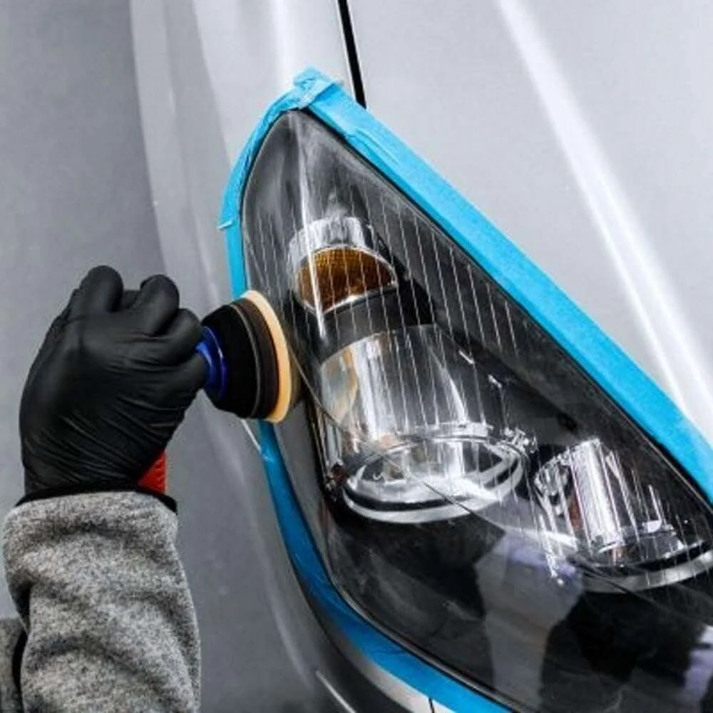 Se aplică o pastă de polish pe faruri și se folosește o mașină de lustruit sau manual, pentru a îndepărta zgârieturile fine și pentru a reda claritatea inițială a farurilor.